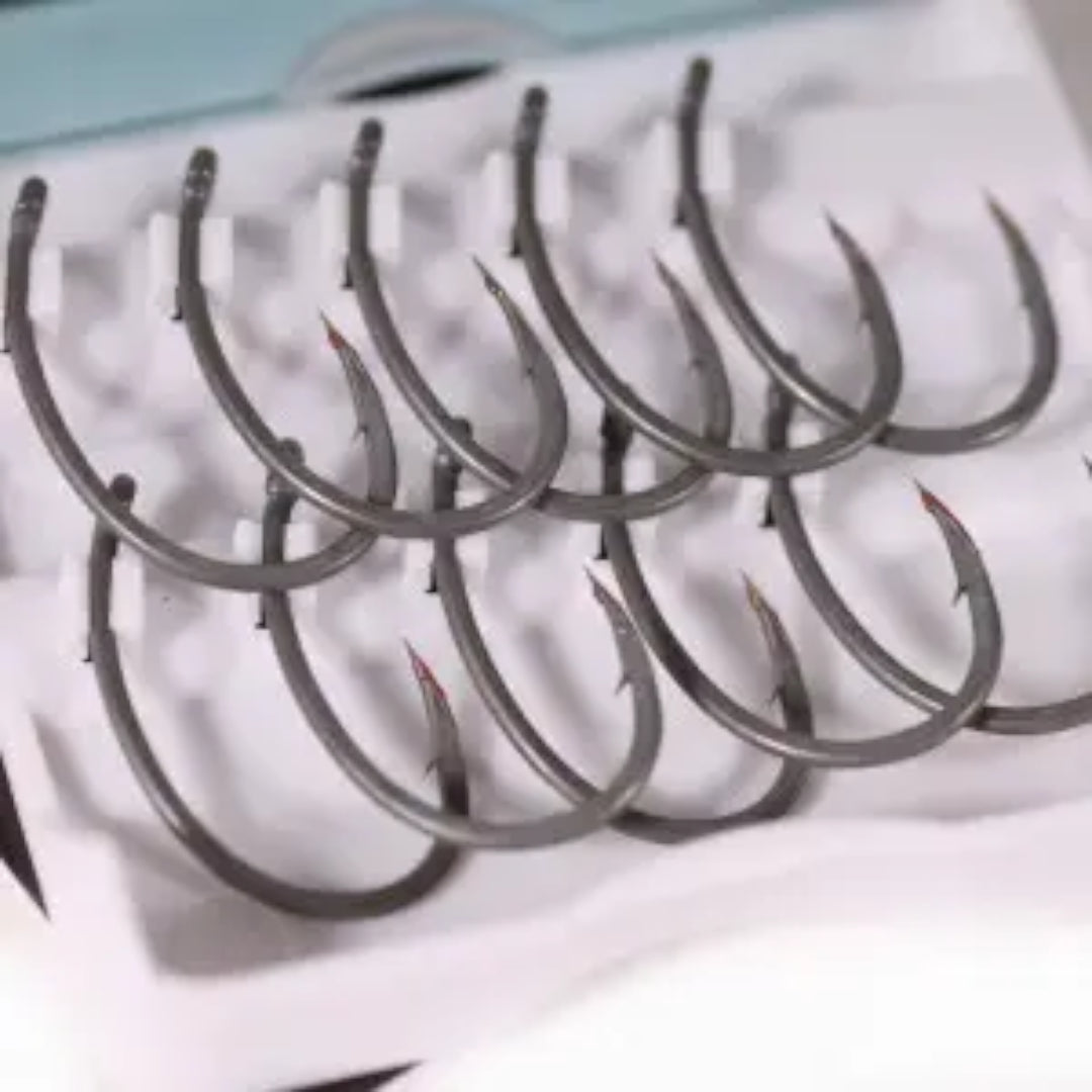 Їхня сильна сторона — максимальна гострота та стабільна робота під час підсікання й виважування. Щоб жало залишалось бездоганним до моменту риболовлі, воно захищене червоним воском, який потрібно зняти перед закиданням. Гачки постачаються у жорсткому кейсі, де кожен екземпляр зафіксований у кліпсі — зручно зберігати й діставати.