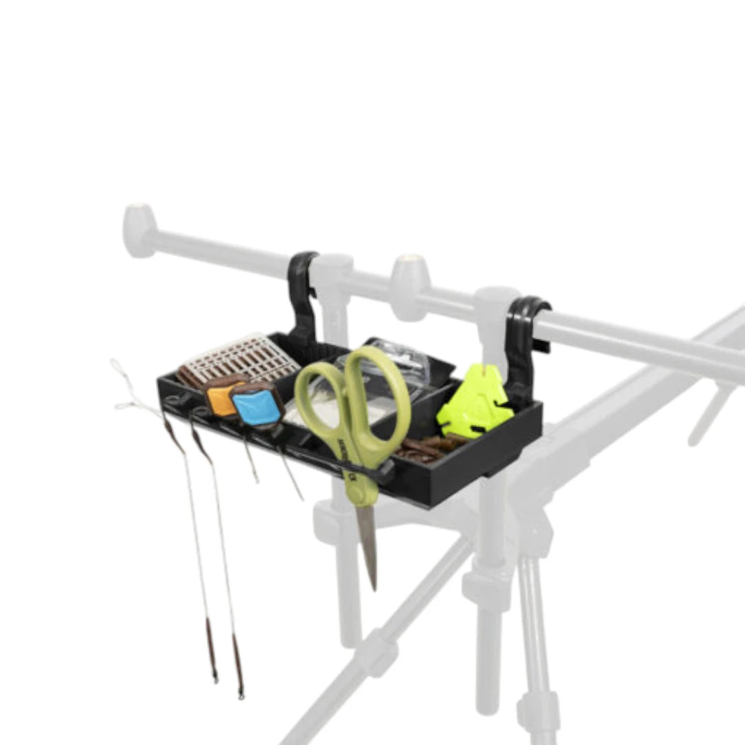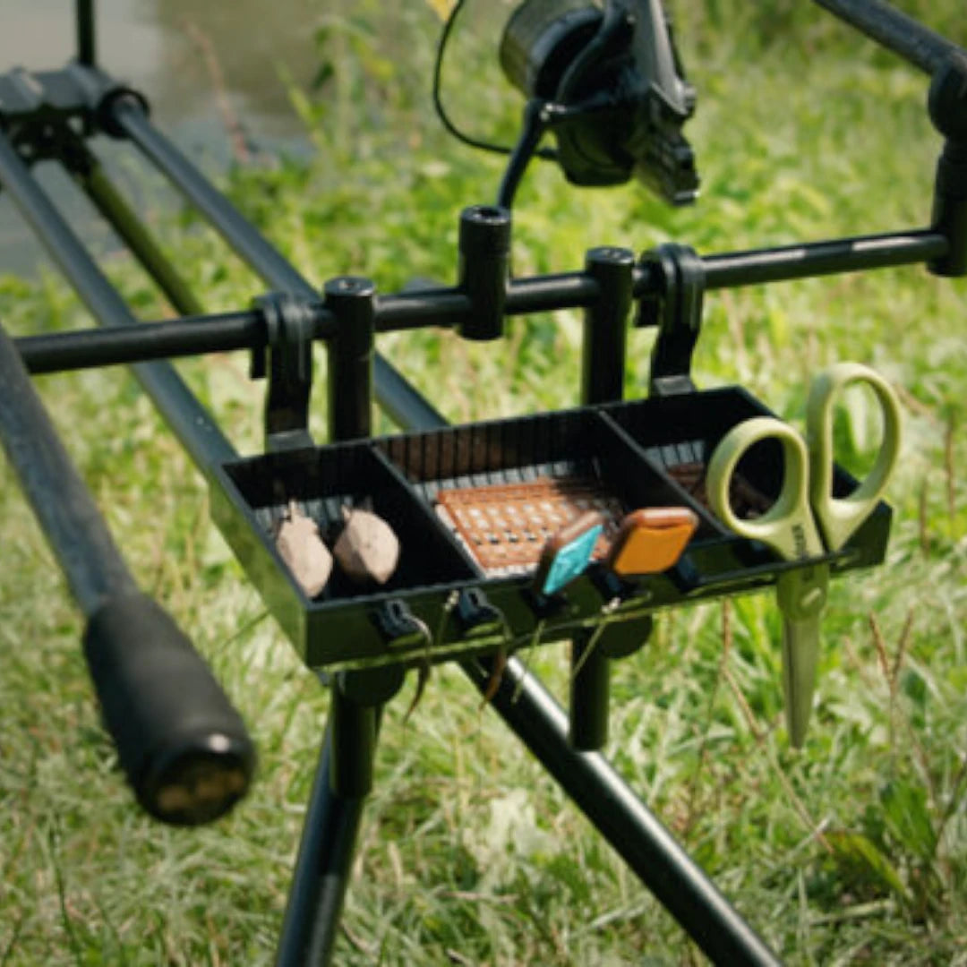 ShelfPOD — практична поличка для рибалок, які ловлять з родпода/триноги або використовують буз-бари на стійках. Вона тримає під рукою найважливіше: дрібні аксесуари, насадки, інструменти, ПВА — без зайвих нахилів і пошуків у сумці.